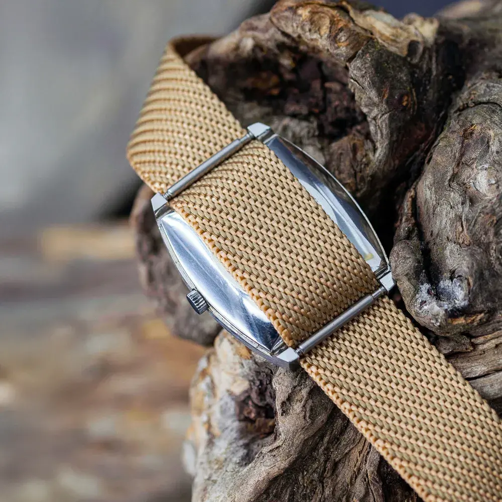 Beige, subdued NATO strap, made of very soft and durable nylon. You will definitely appreciate the comfort of use.