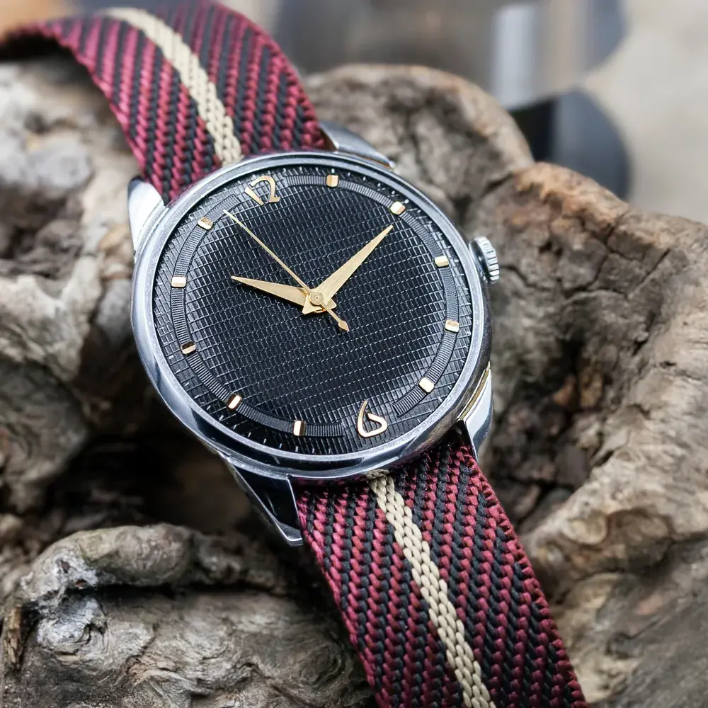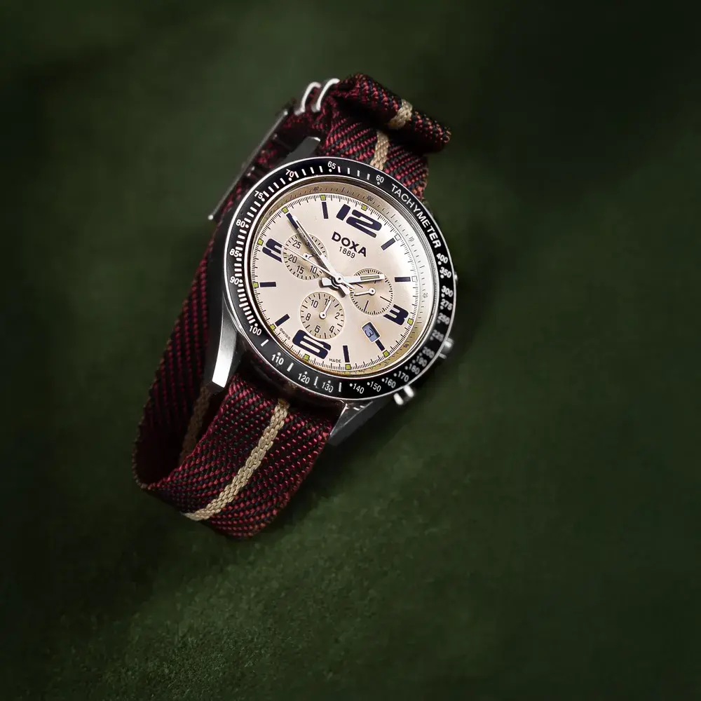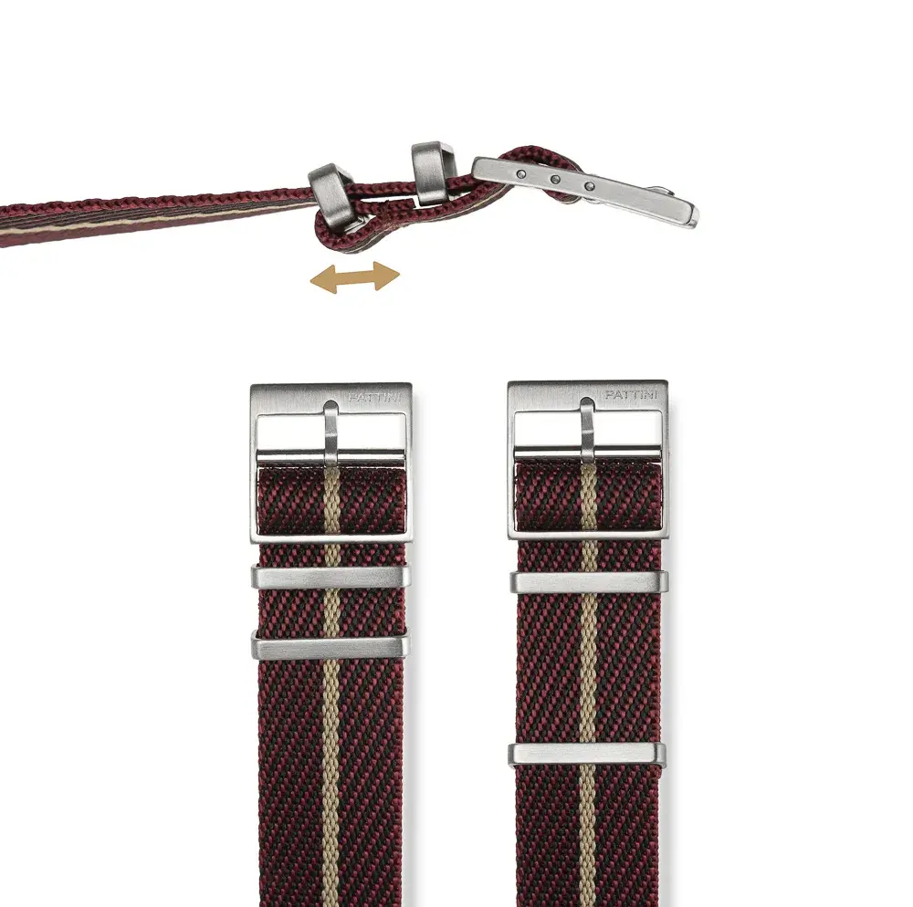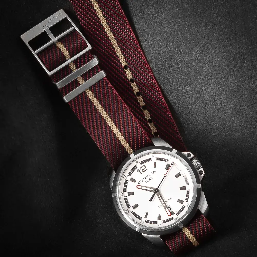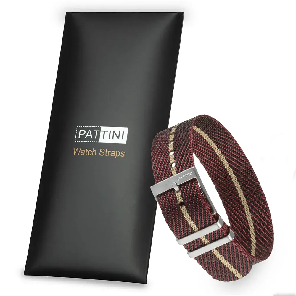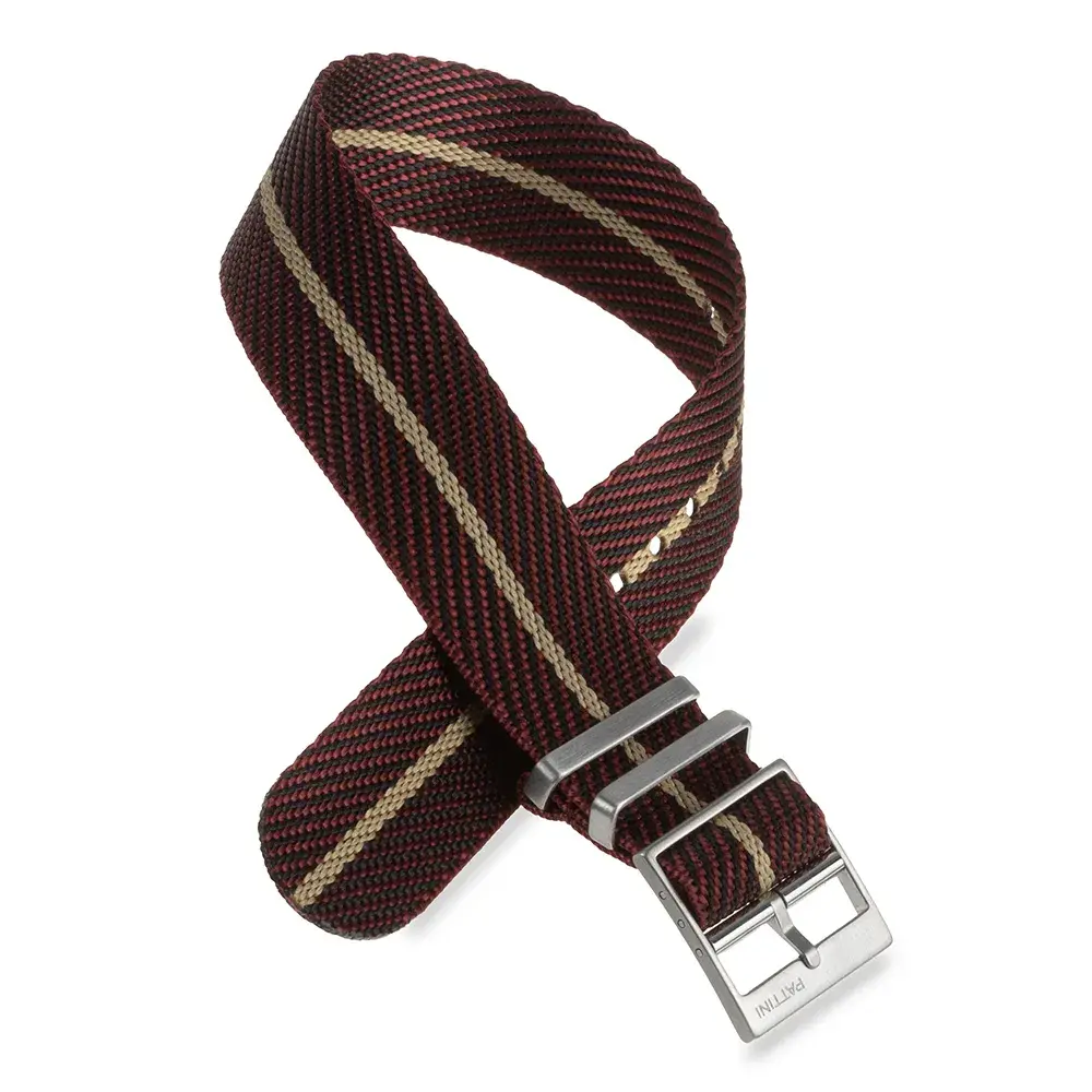 Combination of burgundy and black colors with a beige stripe running through the middle. NATO strap woven diagonally from thin nylon. You will definitely appreciate the comfort of wearing it.