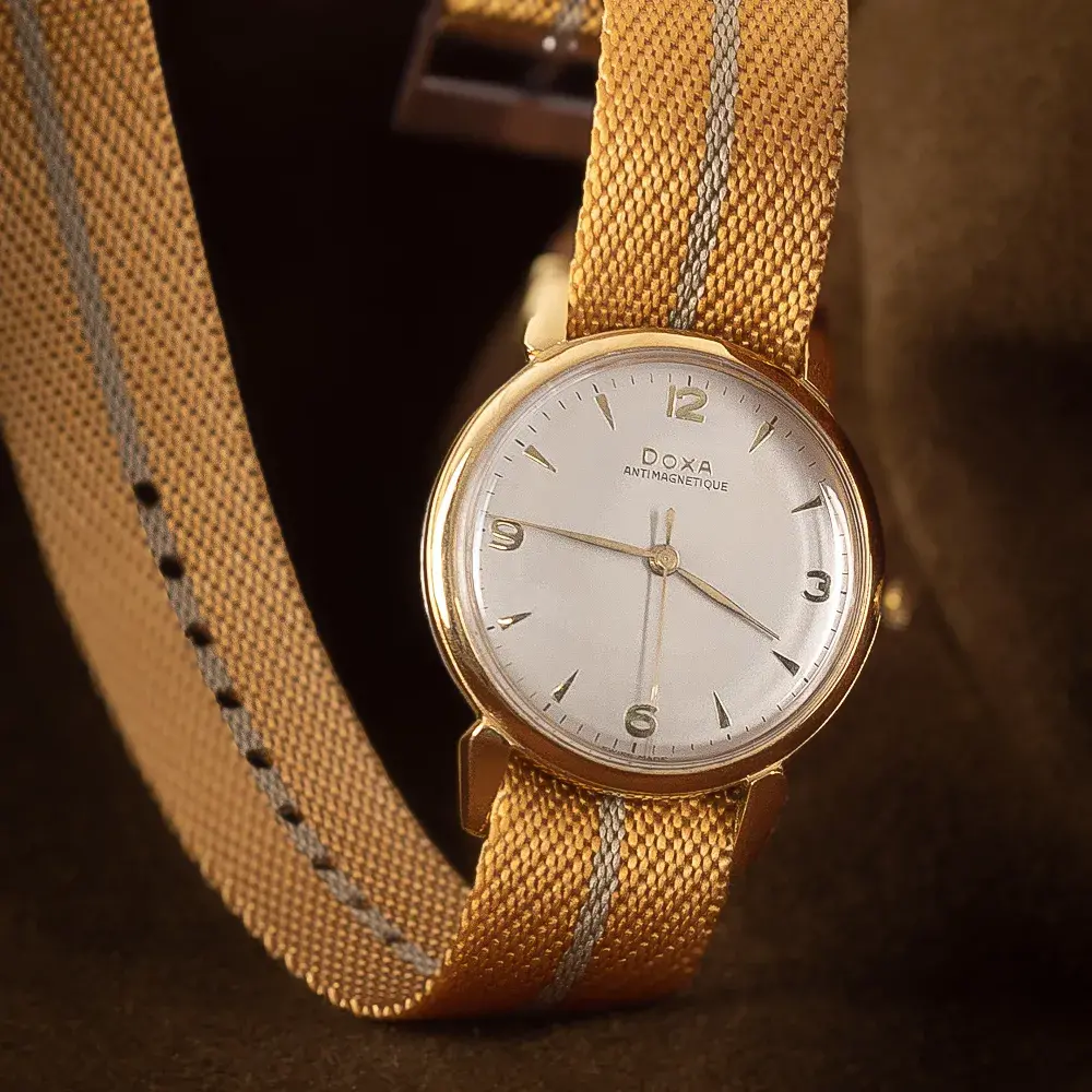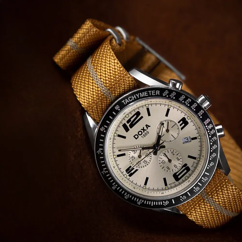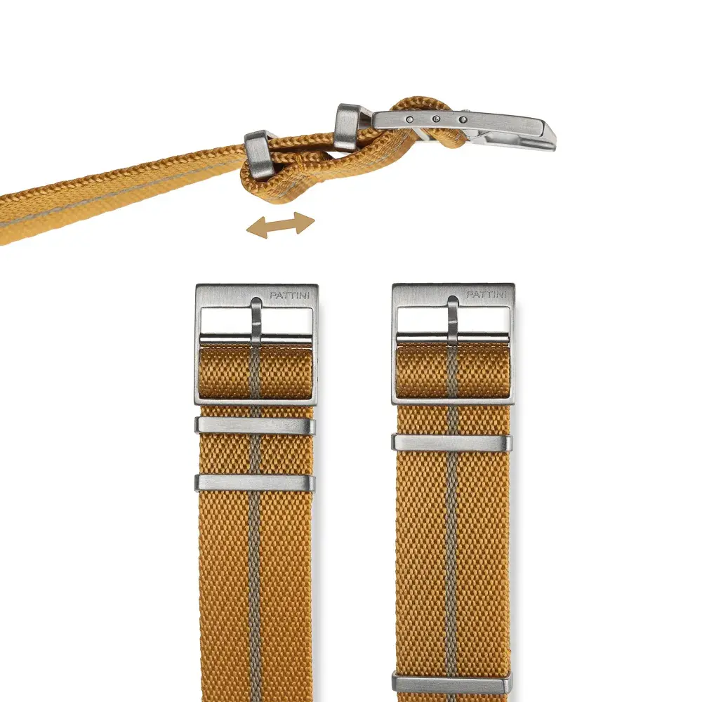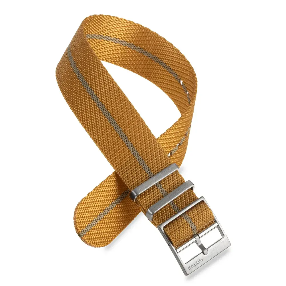 NATO strap in a gold hue with a beige stripe. Woven from durable nylon.